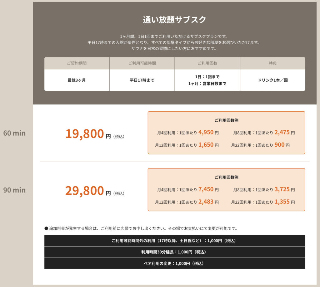 平日限定だけど、通えば通うほどお得なサブスクも用意されてるんだ。