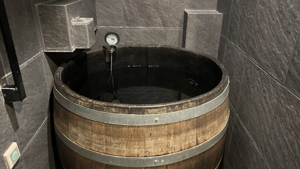 扉を開けると樽型のサウナ室が「どーん」と鎮座。壁に埋め込まれているスタイルで驚き。