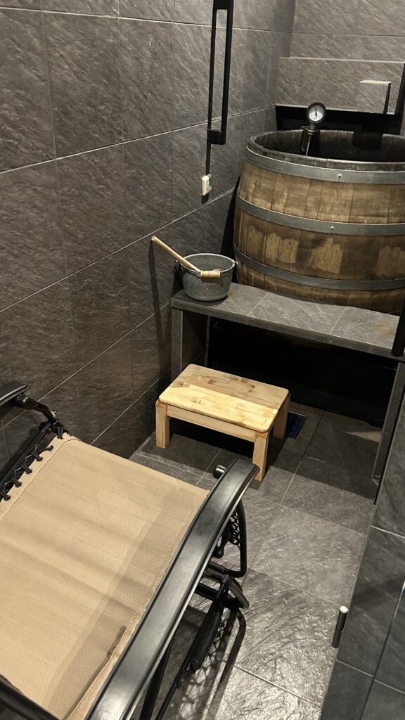 通常のサウナ室に樽冷水風呂のこちらのお部屋一人用。扉を開けるとコンパクトな作り。