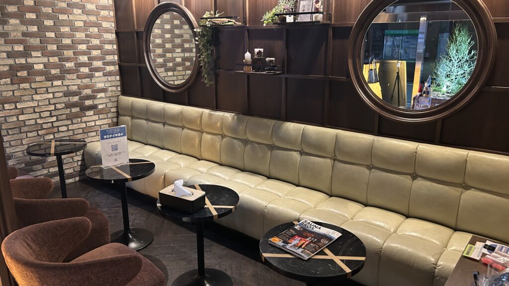 扉をくぐると、そこに広がるのはサウナ施設とは思えないほど落ち着いたラウンジ空間。レザー調のソファが配置され、まるでホテルラウンジのような雰囲気です。待ち時間も、ここでゆったり過ごせるのが嬉しいポイント。