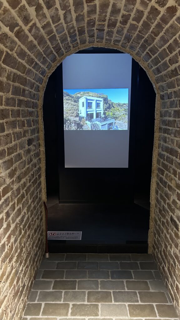 トンネルの奥には、自然の風景を映し出すサイネージが設置されています。レンガ造りのアーチと映像演出が相まって、まるで別世界への入り口をくぐっているような感覚。