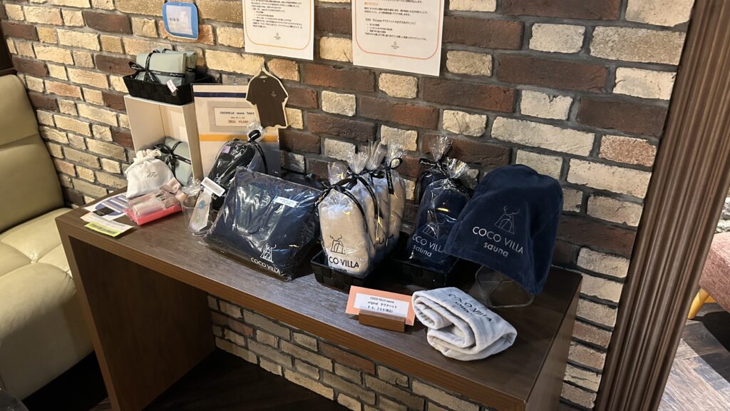 サウナハットやタオル、アロマなどのサウナグッズが並びます。おしゃれな施設だけあって、グッズのセレクトも洗練されていて、つい手に取って見たくなるものばかり。