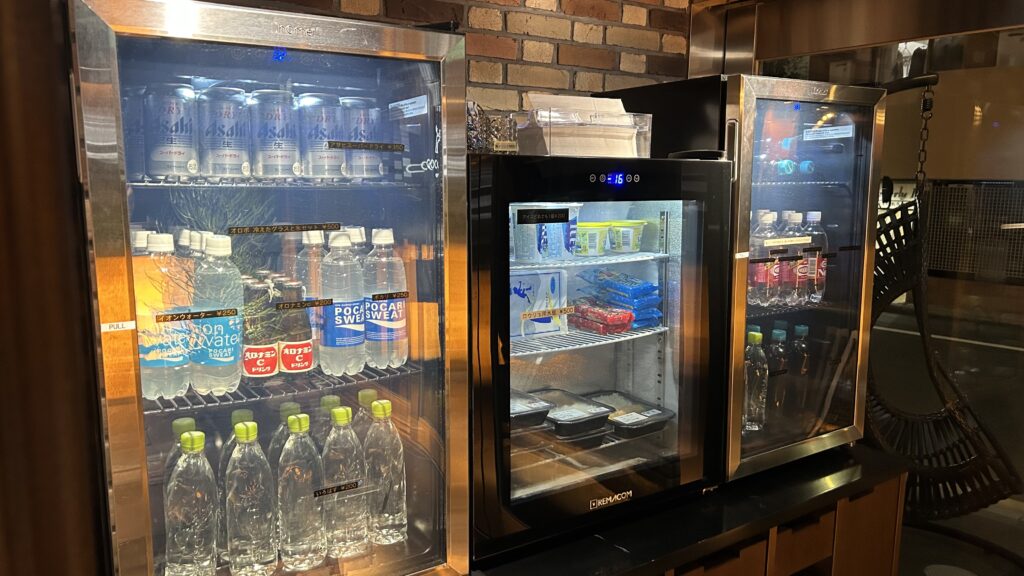 ラウンジ横には、ドリンクや軽食が入った冷蔵庫も用意されています。サウナ後に嬉しいミネラルウォーターや炭酸水はもちろん、ビールなどのアルコール類もラインナップ。火照った体に冷たい飲み物を流し込む、この瞬間もまた格別です。