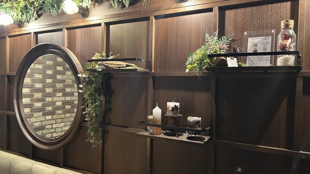 ラウンジの壁面には、グリーンやキャンドル、アロマを感じさせる小物がさりげなくディスプレイ。こうした空間づくりも、COCO VILLA saunaが「大人向けの個室サウナ」と言われる理由のひとつだと感じました。