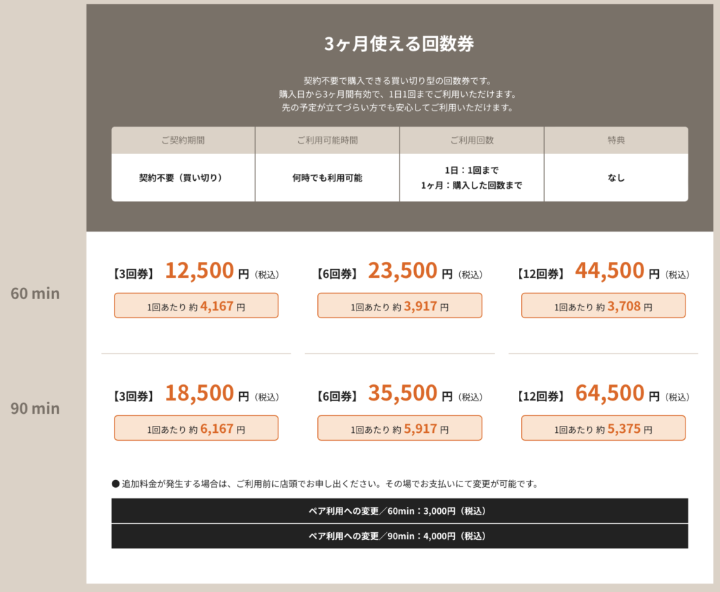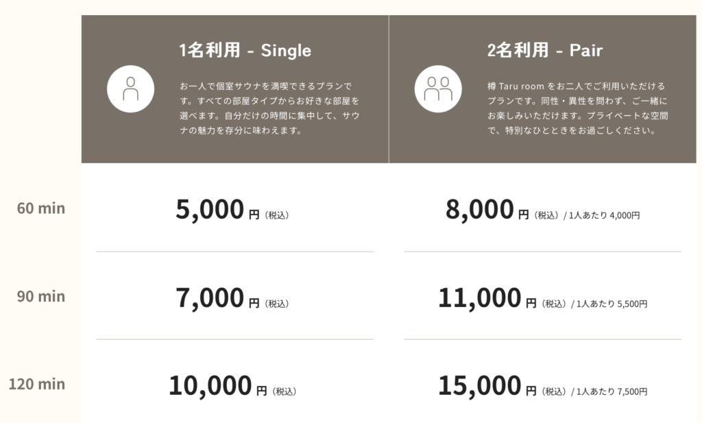 | 料金 | 料金(都度利用) 1名利用(Single) 60分:5,000円(税込) 90分:7,000円(税込) 120分:10,000円(税込) 2名利用(Pair)※主にTaru room 60分:8,000円(税込) 90分:11,000円(税込) 120分:15,000円(税込) 1名利用 Short time 15分:1,000円(税込) 30分:2,000円(税込) |