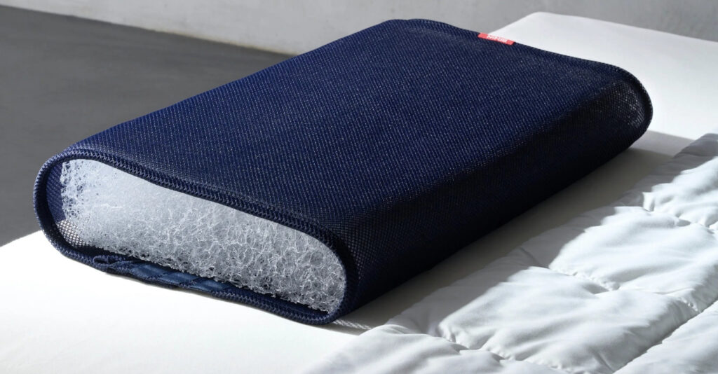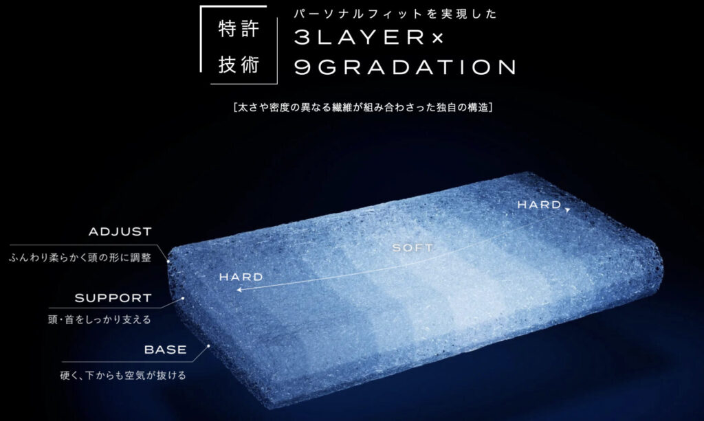 最大の特徴は、ポリエチレン素材を立体的に編み込んだ独自の3層構造。太さや密度が違う繊維を組み合わせていて、頭の重さに合わせてじんわり沈み、ふわっと支えてくれるつくりになっています。