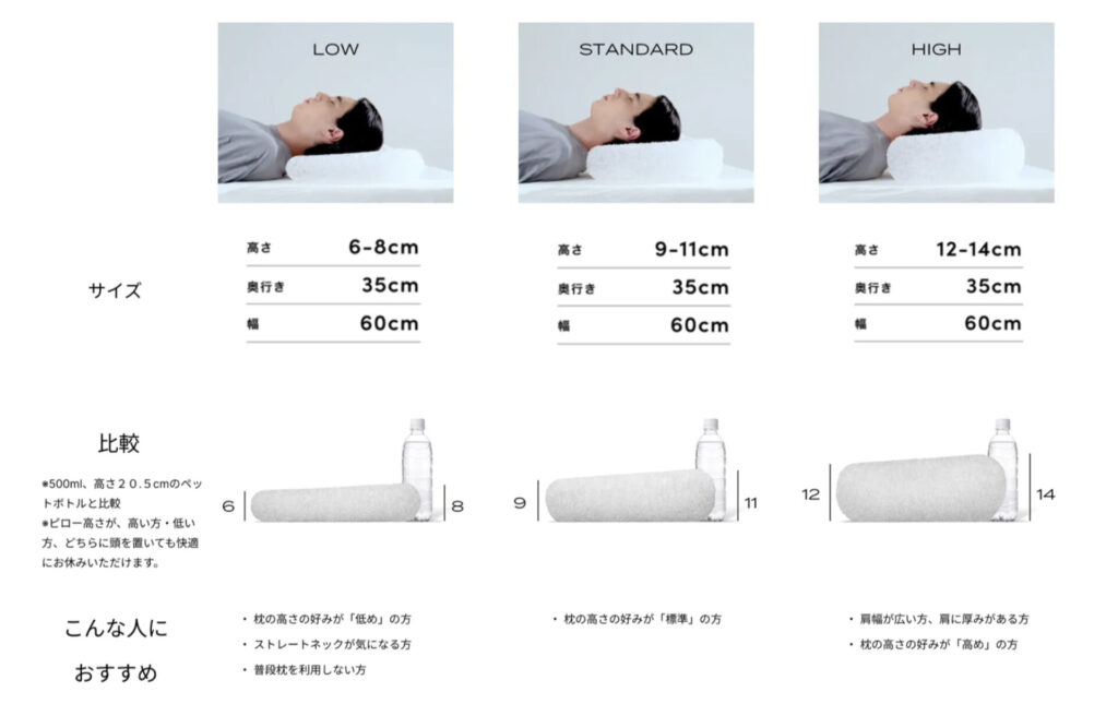特に初めての人はスタンダードが使いやすく、寝姿勢や首の悩みが明確な人ほど他モデルがハマりやすい印象です。