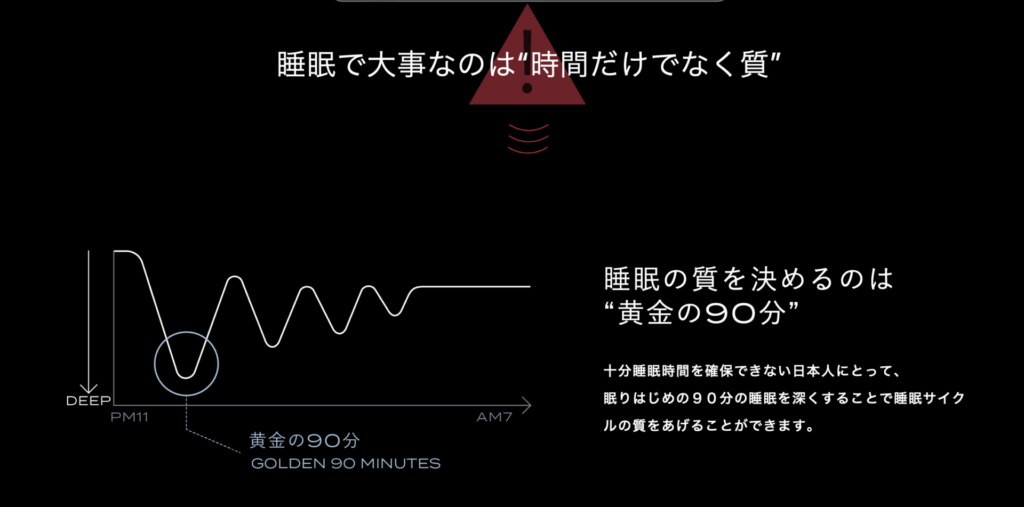 公式では「睡眠時間の長さより、入眠直後の質が大切」「黄金の90分を深くすることで疲労回復度が高まる」という考え方が示されています。