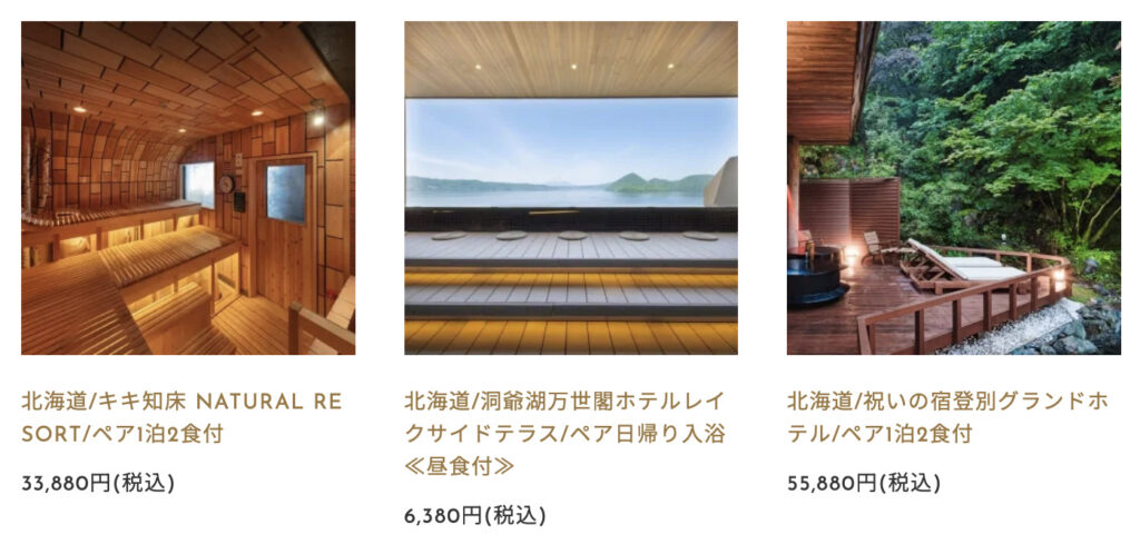 露天風呂付き客室や、美容液の特典付きスパ、フィンランド式アウトドアサウナなど、全国のハイクラスな宿から好みの宿を選べるカタログギフトです。