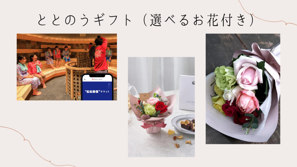 次に紹介するのは人気のサウナ施設チケットと選べるブーケのギフトセット ととのうギフト(選べるお花付き)。