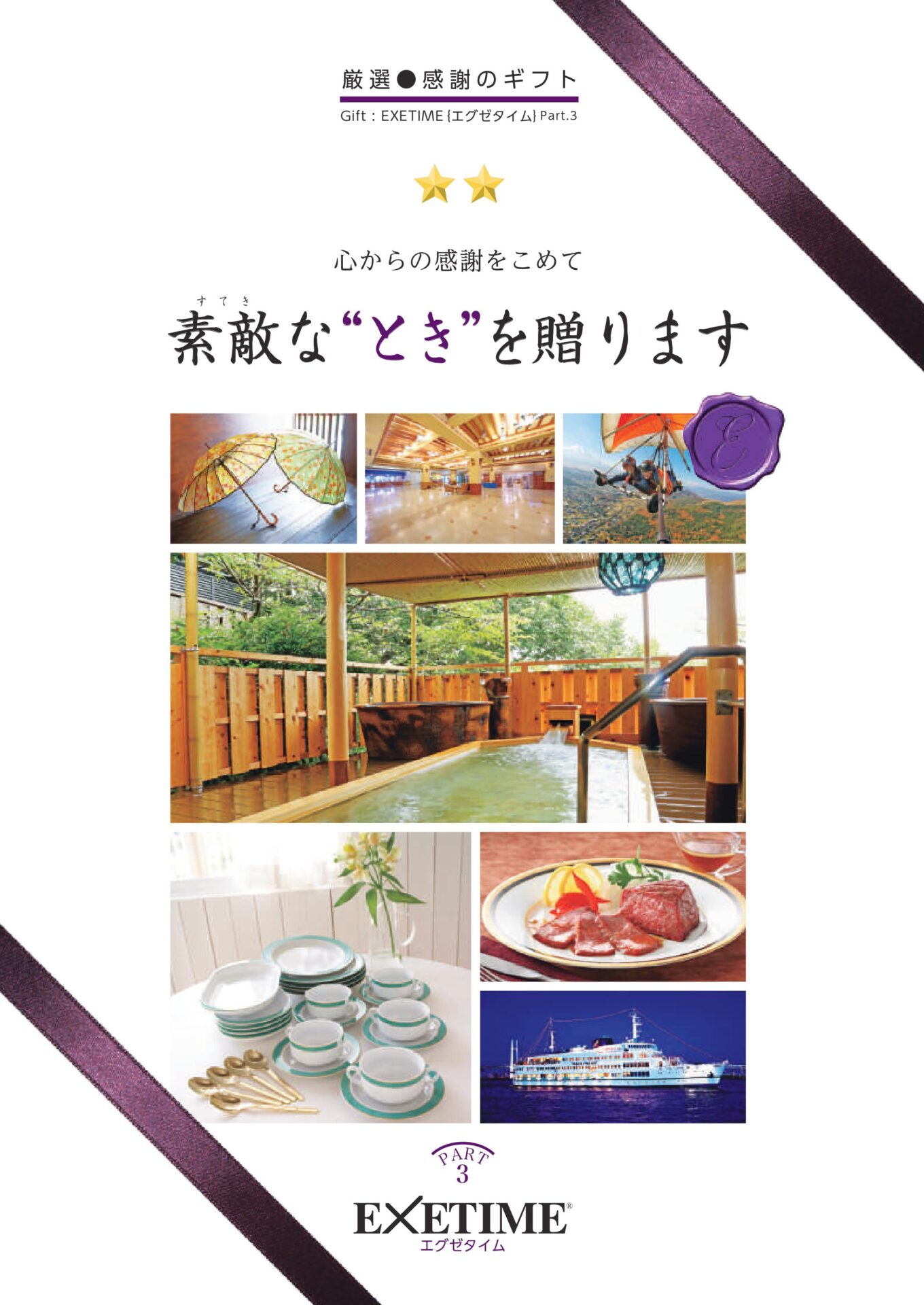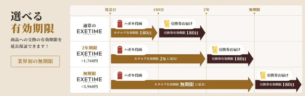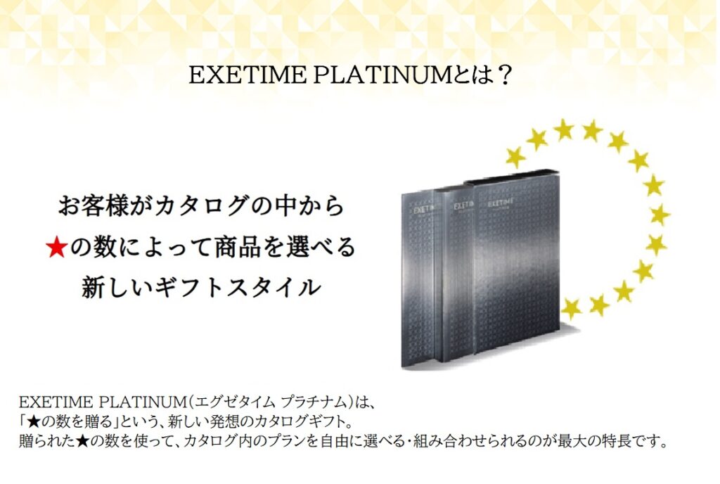「EXETIME platinum」は、温泉旅館・高級ホテル・プレミアムグルメ・ブランド家電など、全国1800以上の体験・商品から自由に選べる最上位クラスのカタログギフト。