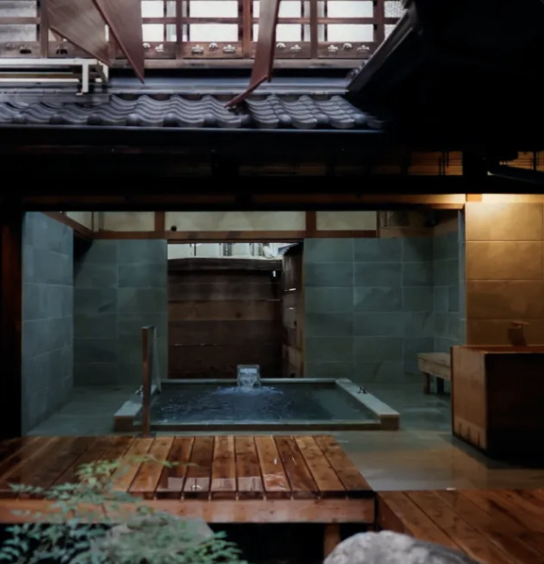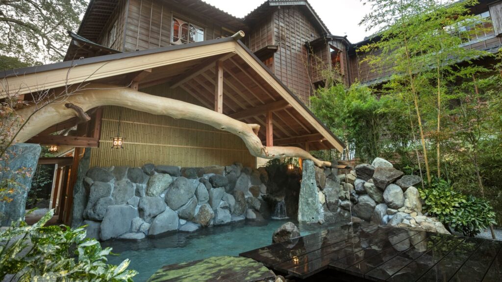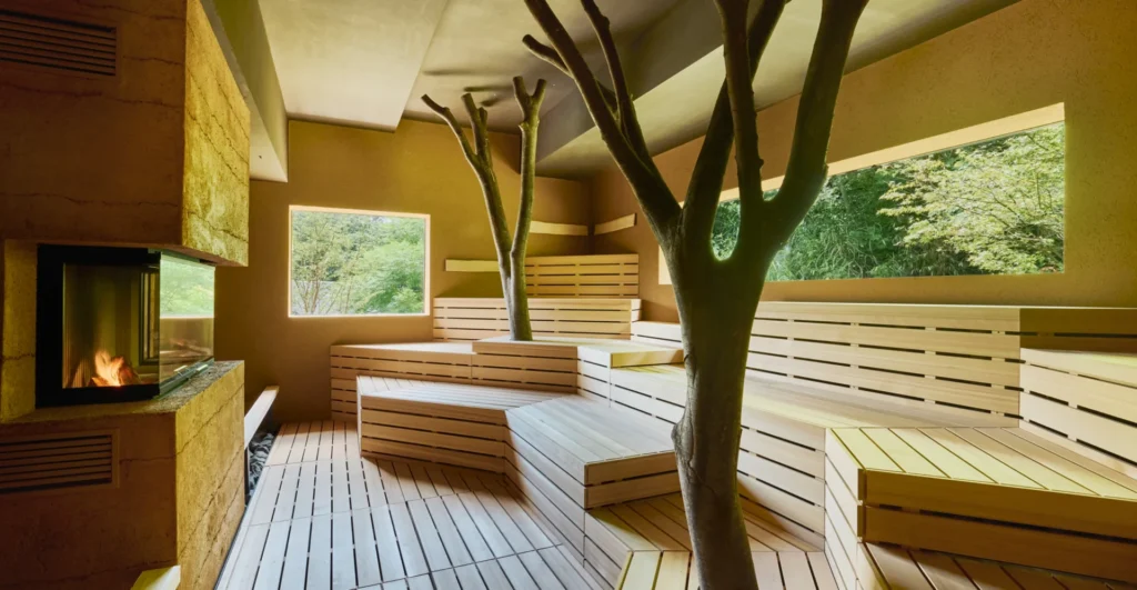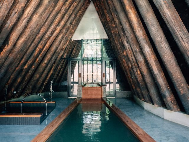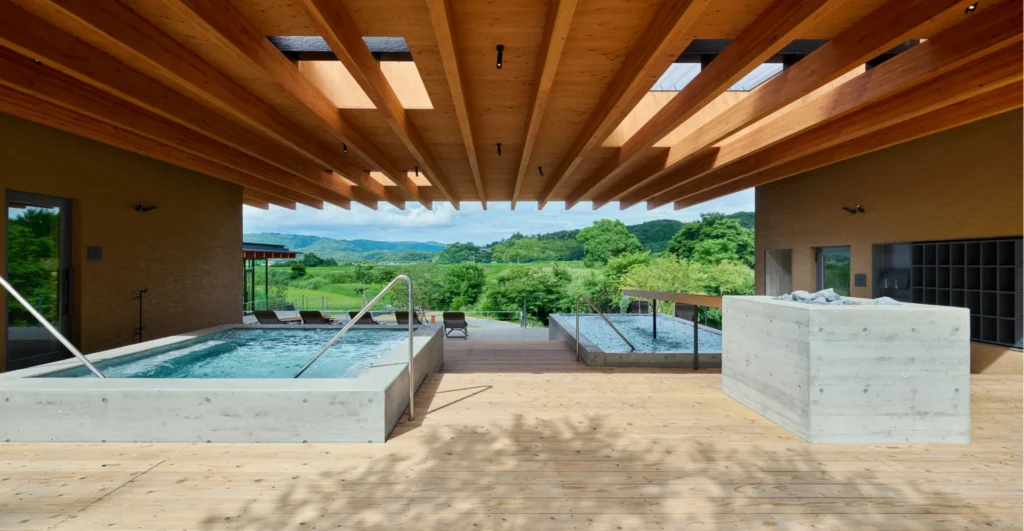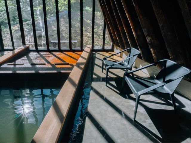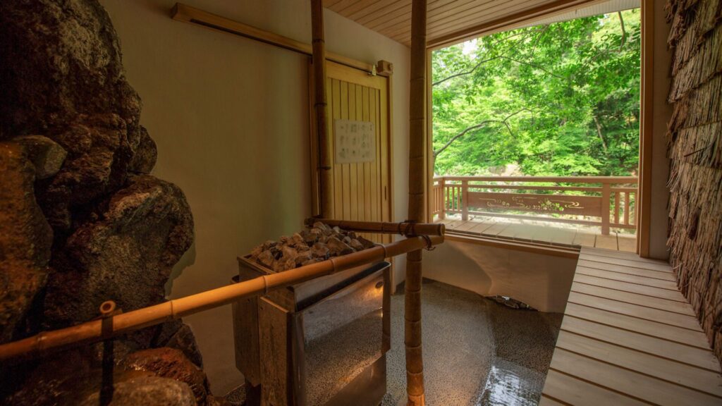 95℃の高温ながら湿度と気流を絶妙に制御し、呼吸が驚くほど楽な「優しい熱」を実現。木の香りと温泉蒸気が交じり合い、身体の芯からじんわり温まる。湯面が流れる床や森を望む窓など、全身で自然とつながる設計です。100%源泉かけ流しの温泉浴槽(立ち湯・寝湯)と天然湧水の水風呂が直結し、熱と冷、そして癒しが循環。