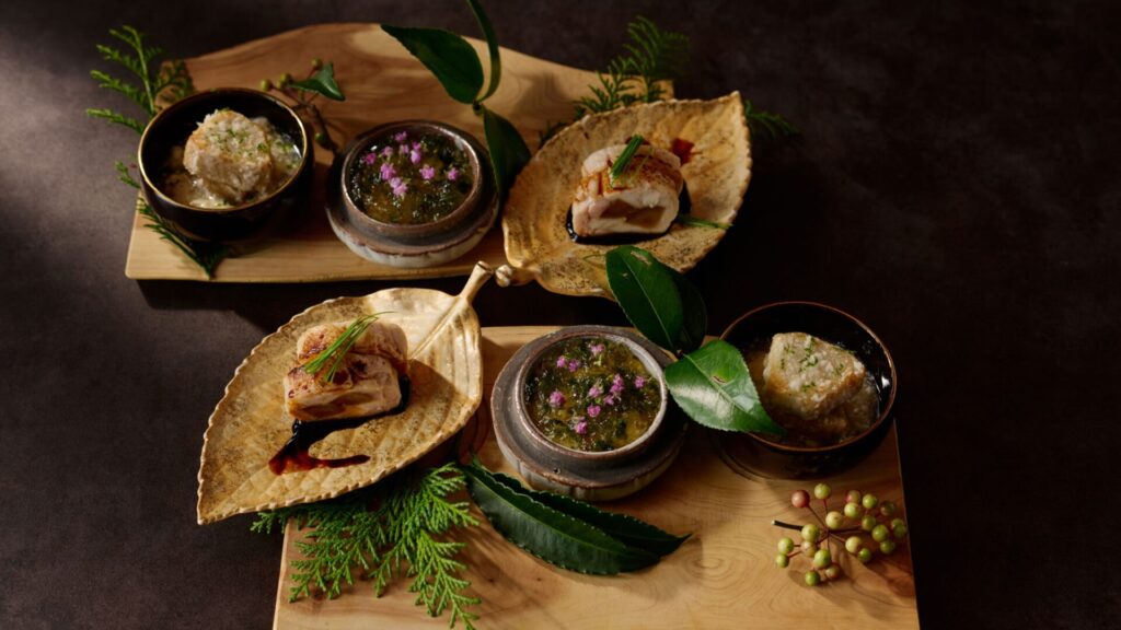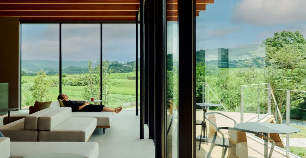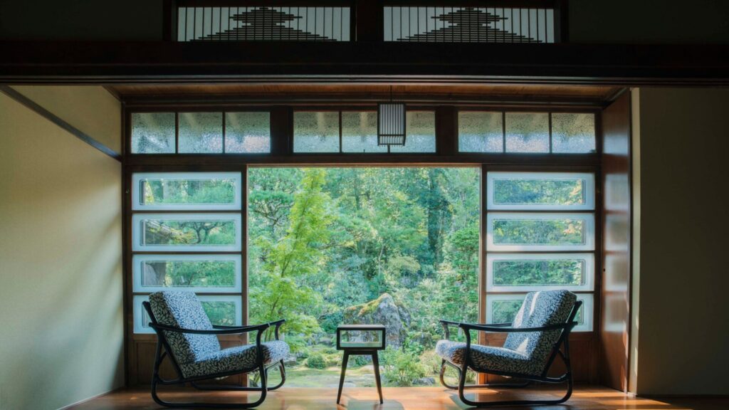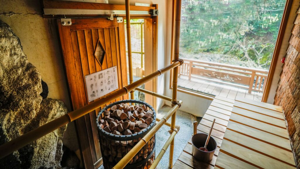 道南杉をふんだんに使った木造建築は合掌造りのように温かく、外の渓流や森と一体化した設計が圧倒的。静けさと自然音が支配する室内では、ただ“呼吸する”ことそのものが整いの時間になります。