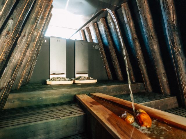 メインのケロサウナは90℃前後の高温高湿。薪ストーブの力強い熱と木の香りに包まれ、セルフロウリュで好みの蒸気を作り出せます。