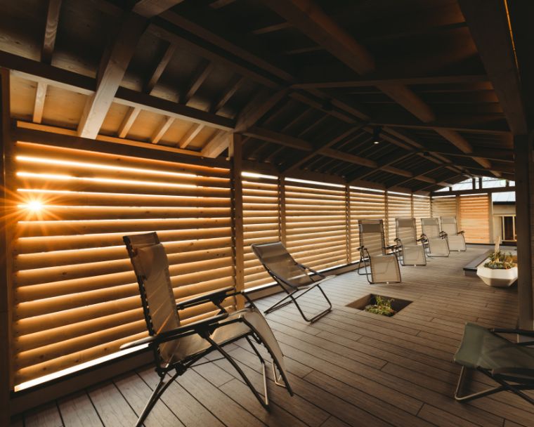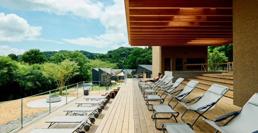 外気浴は2階テラス「tuuli」。星空を望むインフィニティチェアが並び、岡山屈指の開放感を誇ります。サ飯やスムージーも人気で、食・音・光が溶け合うトータルウェルネスサウナとして注目を集めています。