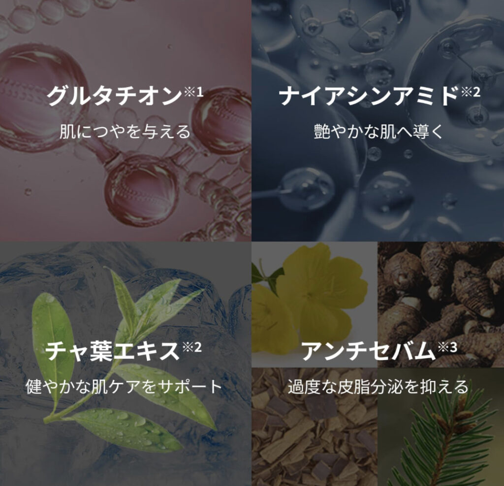 グルタチオンやナイアシンアミドを配合し、乾燥しやすい夏肌に水分を補給。