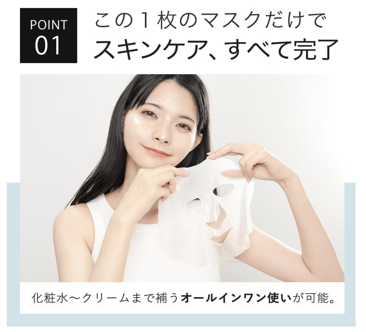 ミネラルを含むまろやかな水質で、肌をやさしく包み込みながらうるおいを補給します。化粧水・美容液・乳液・クリームの役割を1枚で担うオールインワン。