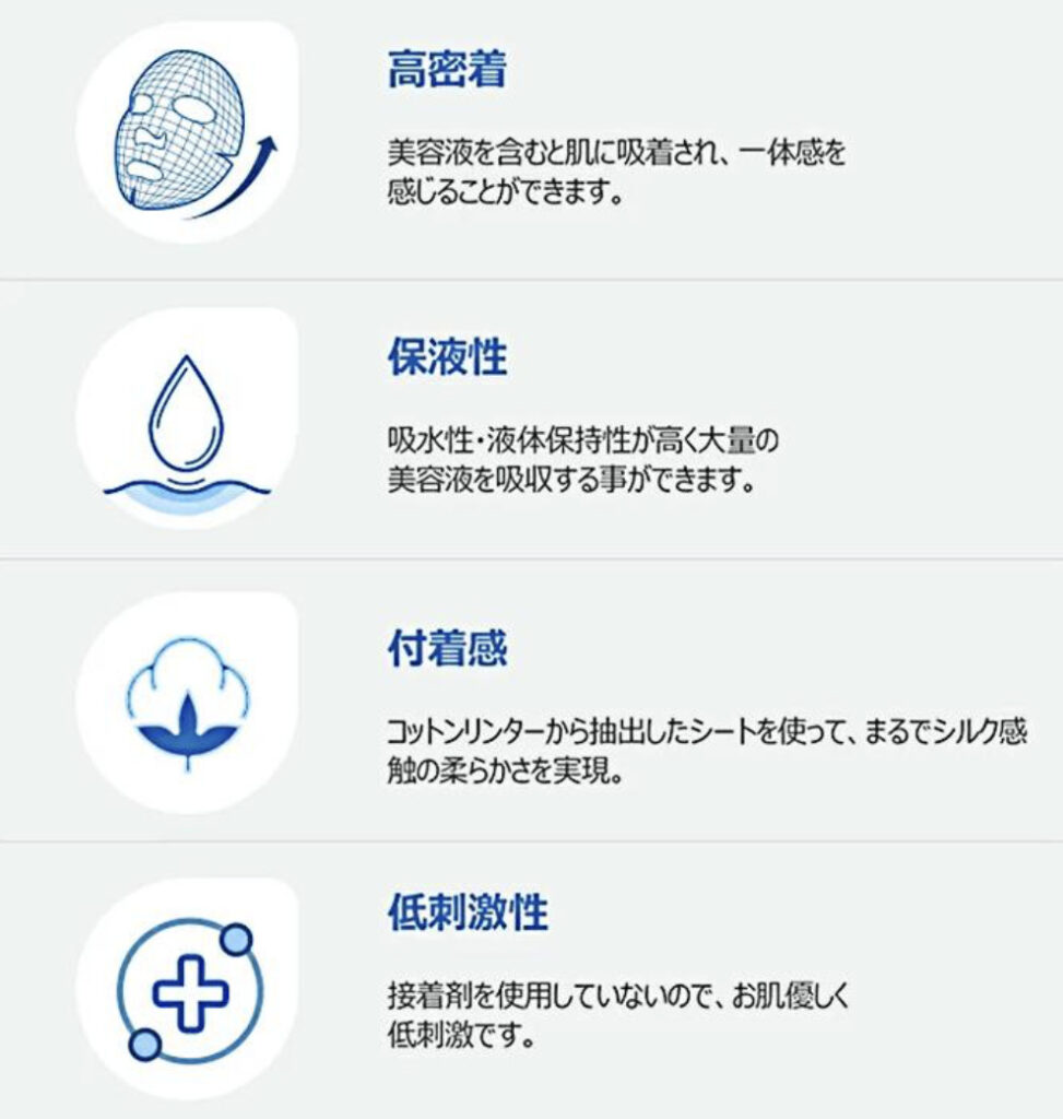 ヴィーガンセルロース100%のシートが顔にぴたっと密着し、27mlの美容液をムラなく届けます。
