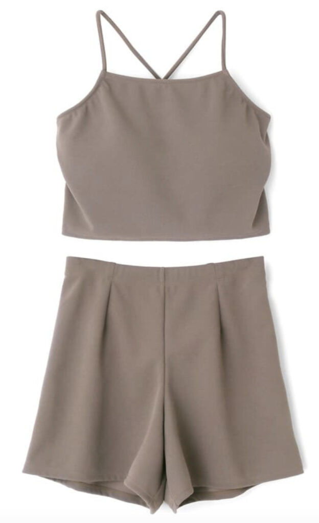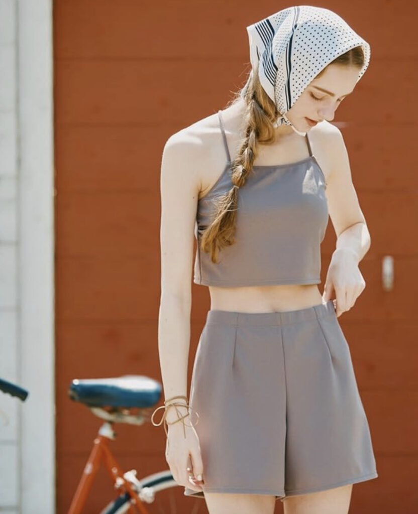 3.体型カバーと着回しのしやすさ◎ビスチェ風トップス+ハーフパンツでスタイルアップ感も