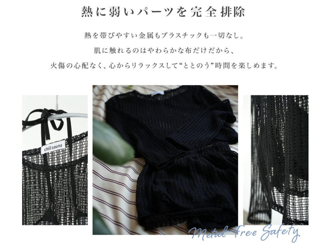 金属レス・ノンワイヤー設計に加え、メッシュトップスとショートパンツを重ねられる3点構成で、サウナ・外気浴・スパまで安心して使える仕様。