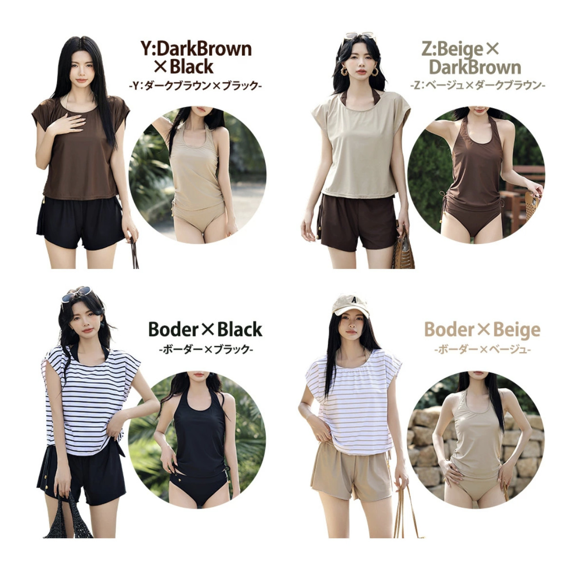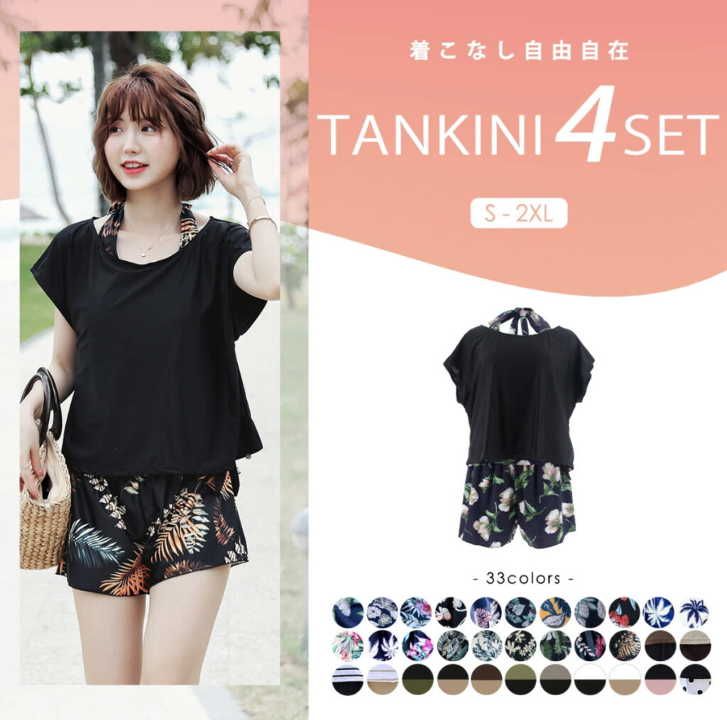 ビキニ上下にタンクトップとショートパンツを重ねた、体型カバー重視のタンキニ4点セット水着です。