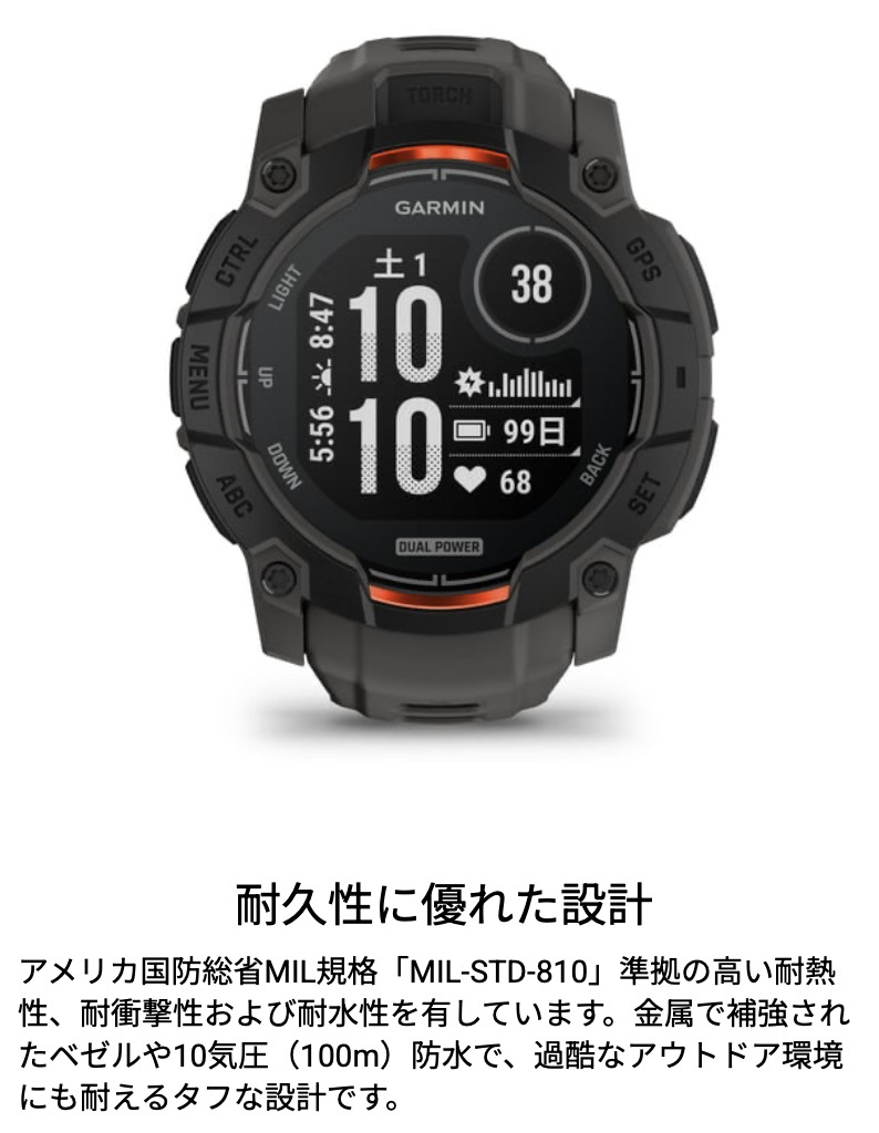 Instinct 3 Dual Power | 45 mm (約52 g)/ 50 mm (約59 g) | モノクロ 1.2 インチ 176×176 px | 山・長旅・充電いらず最強バッテリ |