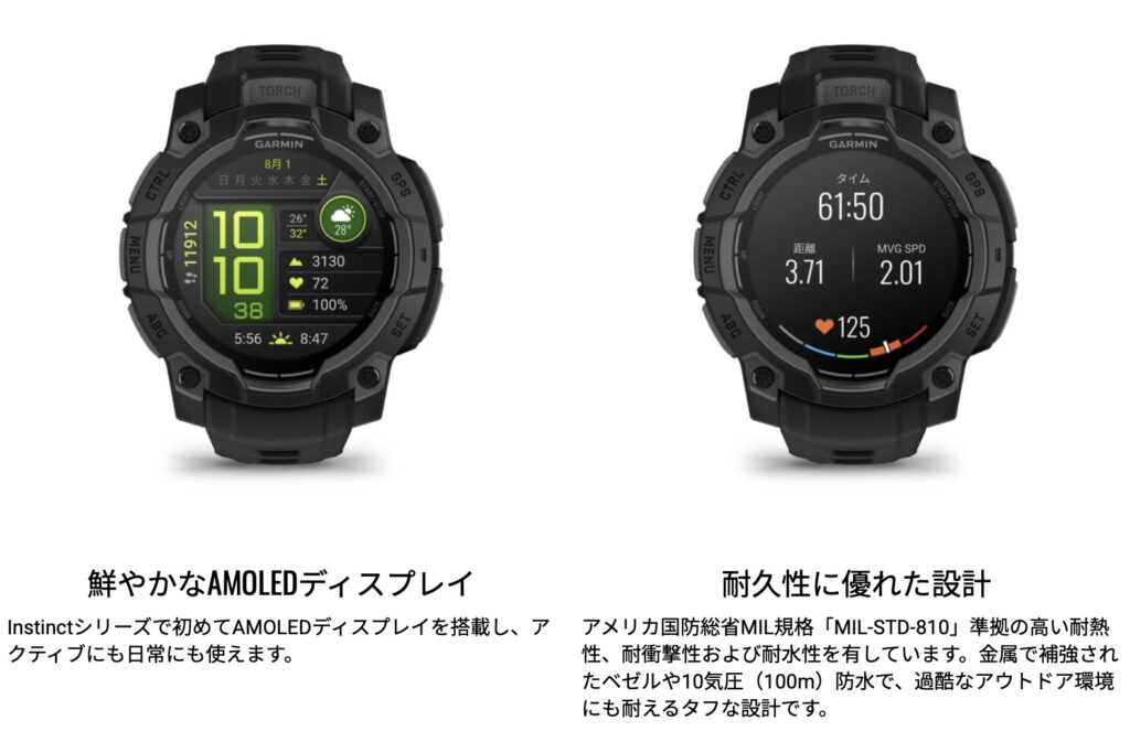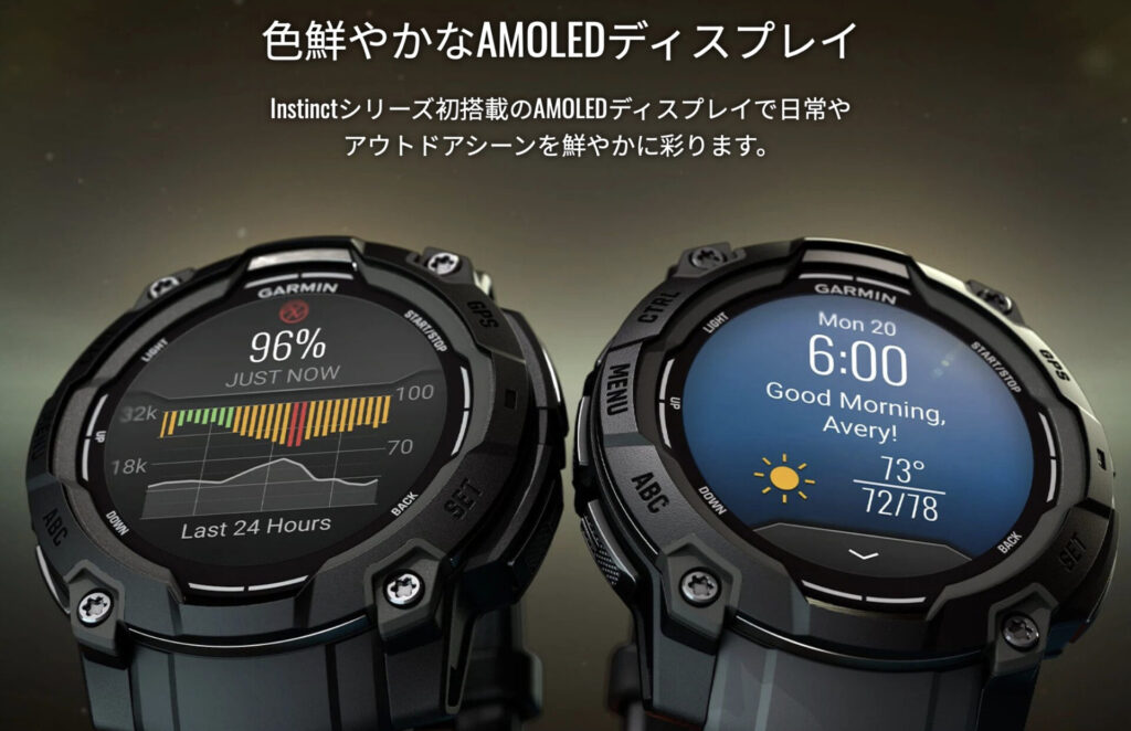 Instinct 3 AMOLED | 45 mm (約47 g)/ 50 mm (約53 g) | AMOLED(カラー有機EL) 1.2 インチ 390×390 px | 高精細カラーで日常も映える |