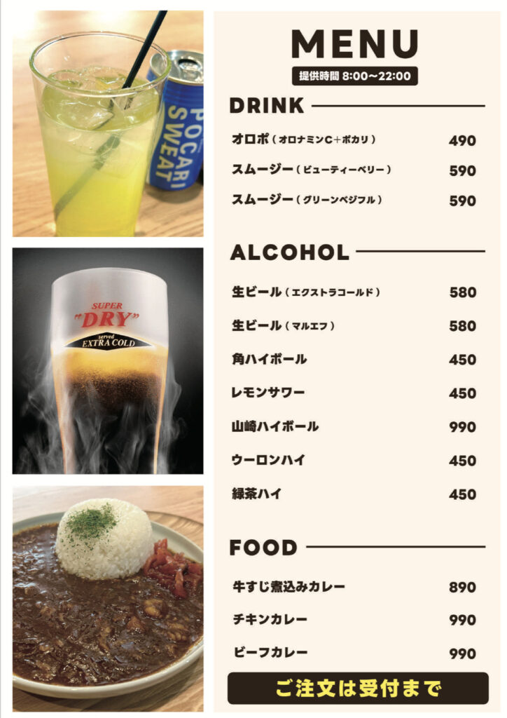 さらに、フードメニューには「牛すじ煮込みカレー」や「チキンカレー」といったしっかり系の料理もあり、整った後の空腹を満たすのにぴったり。軽く飲むのも、しっかり食べるのも、気分に合わせて選べます。