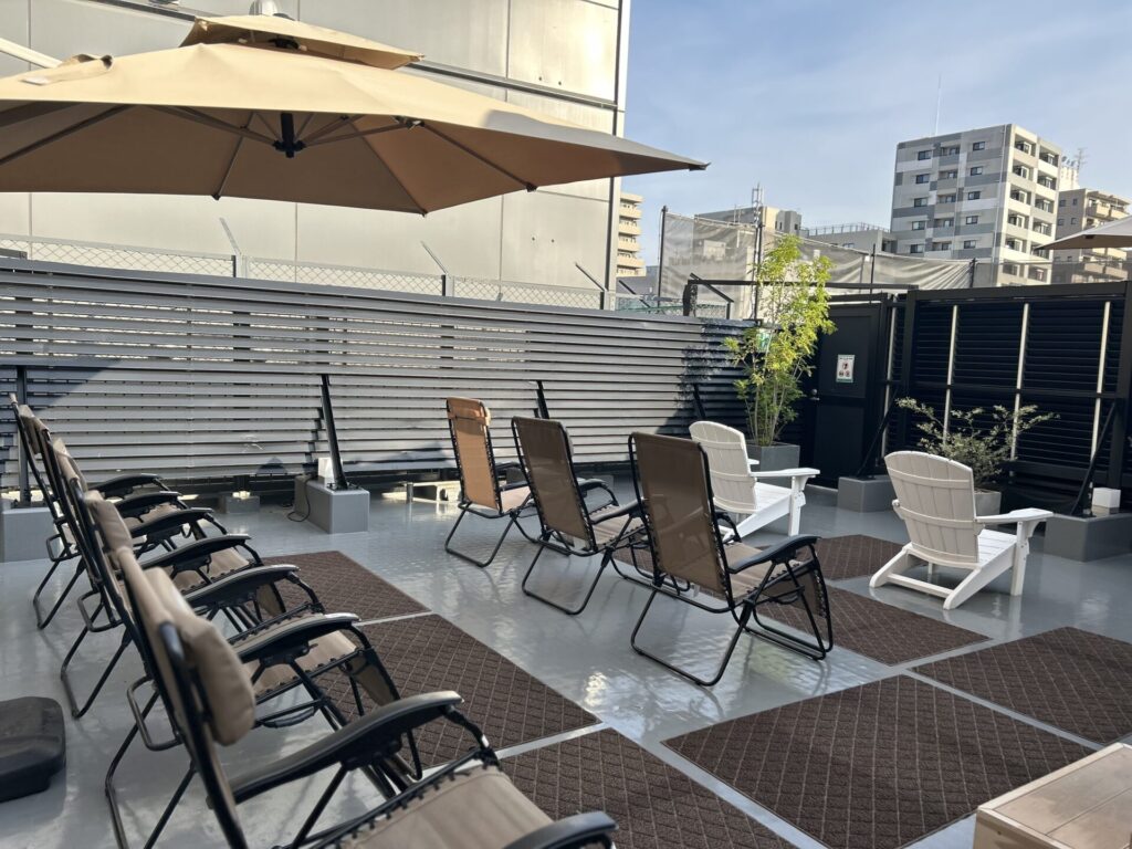 まずは開放感抜群のROOFTOPサウナ。ROOFTOPサウナの大きな魅力のひとつが、屋上にある開放的な外気浴スペース。青空の下でインフィニティチェアに横たわれば、街中にいながらリゾート気分で“ととのい”を味わえます。
