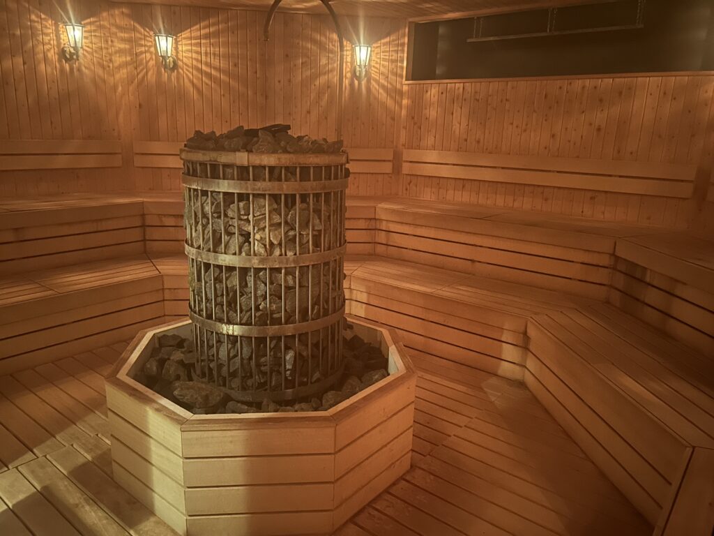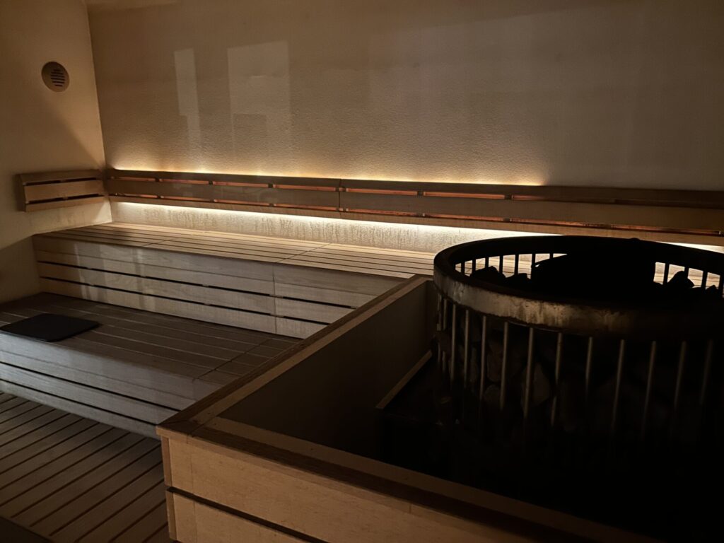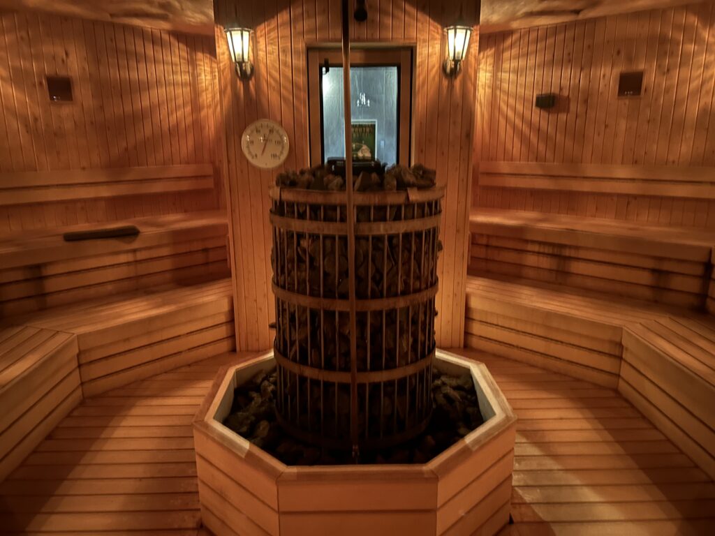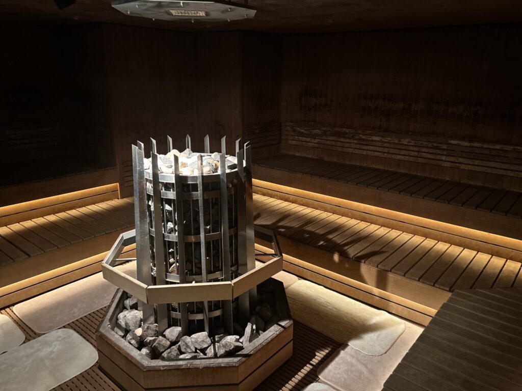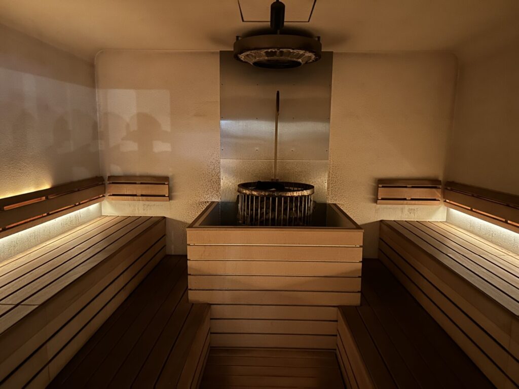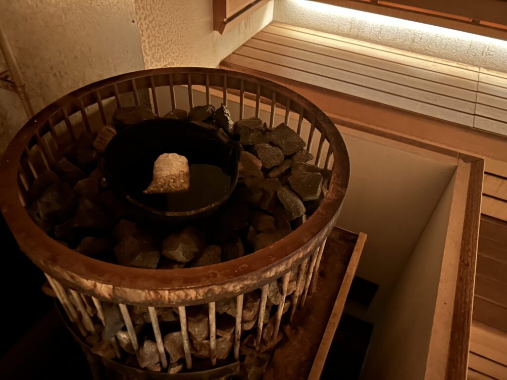 サウナ室は中央に構える大型サウナストーブが印象的で、ロウリュの蒸気が一気に立ち込めると熱気と迫力に圧倒されます。