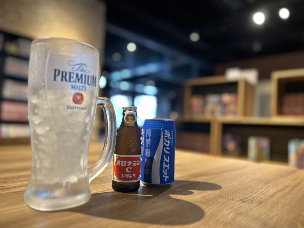 館内のカフェでは、フリードリンク以外にも有料メニューが揃っています。定番の「オロポ(オロナミンC+ポカリ)」はもちろん、スムージーやアルコールも用意があります。サウナ後にキンキンに冷えた生ビールを味わえるのは格別です。