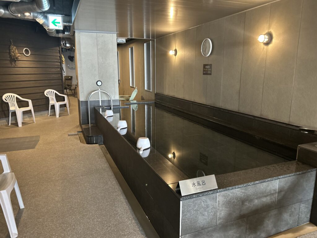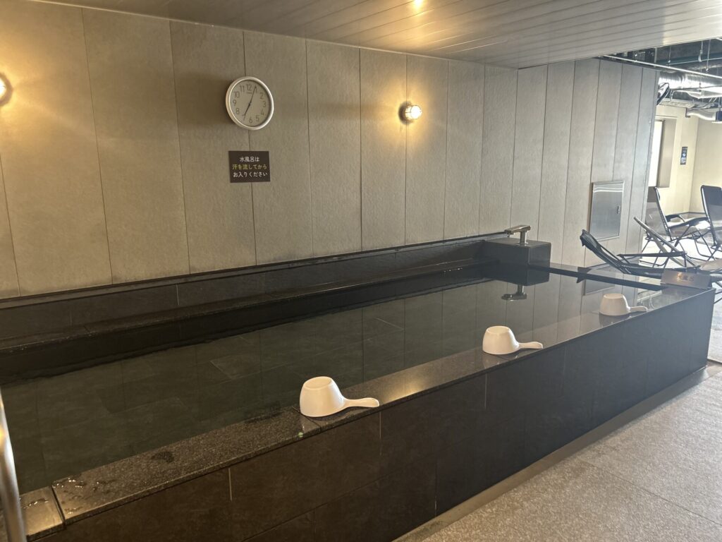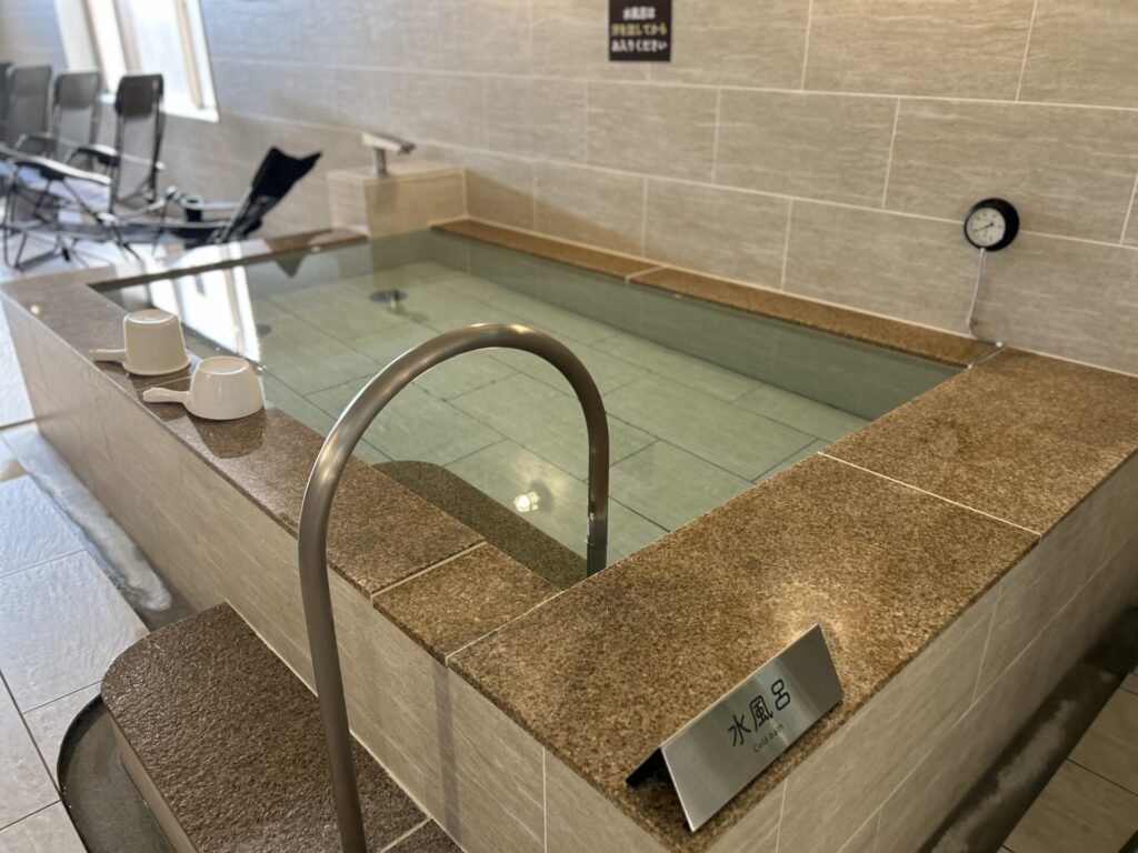 サウナ室を出てすぐの場所に構える水風呂は、こちらも動線がわかりやすく使いやすい設計。5〜8人が同時に入れる広さで、混雑時でもストレスなく利用できるのが嬉しいポイントです。
