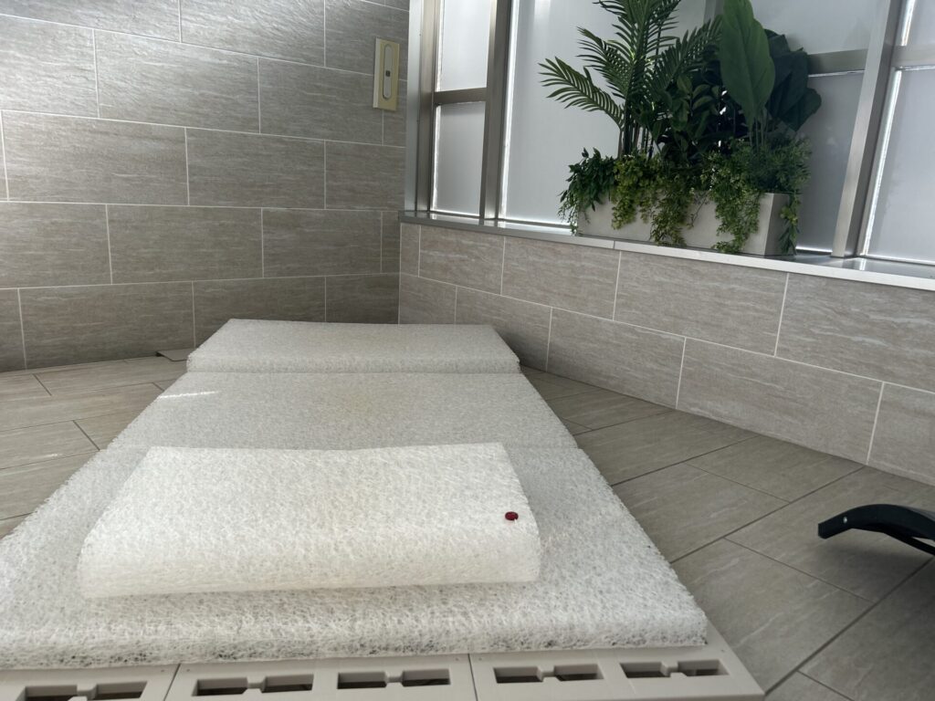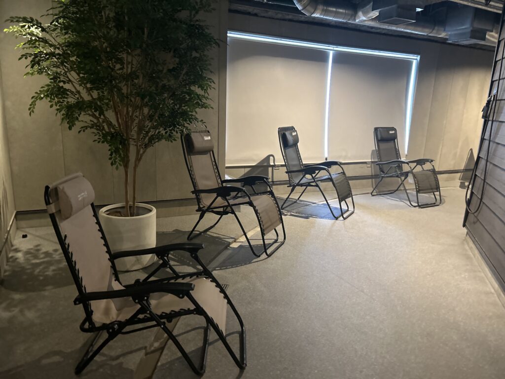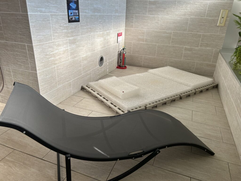 インフィニティチェアは横になった瞬間に全身が脱力して、ふわっと浮かぶような感覚に包まれます。照明も落ち着いていて、誰に気をつかうことなく“自分だけのととのい時間”に没頭できます。