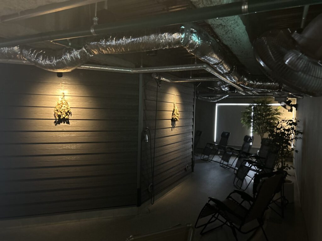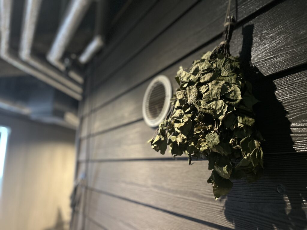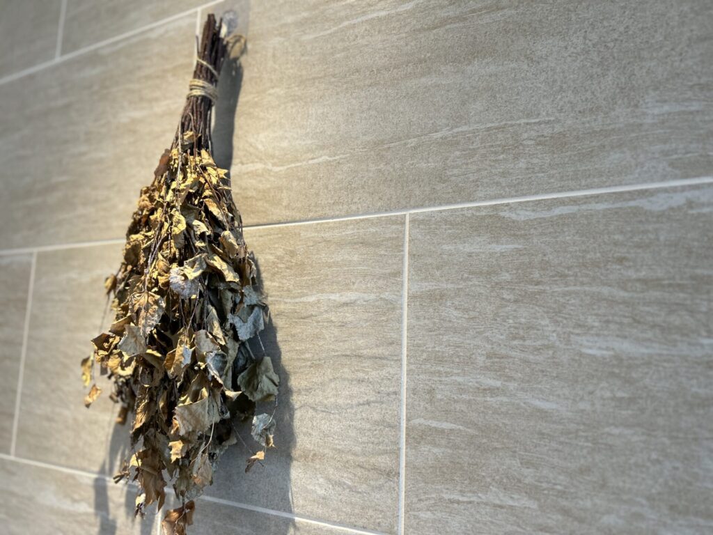 空間の雰囲気をぐっと高めてくれるヴィヒタがさりげなく飾られており、目に入るたびに本場のサウナ気分を盛り上げてくれます。