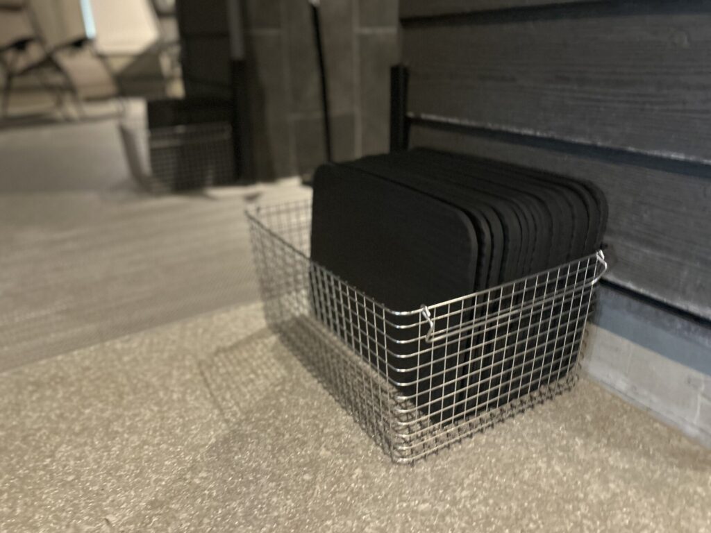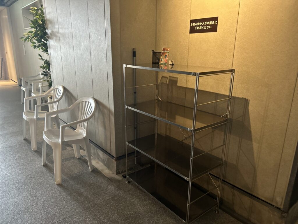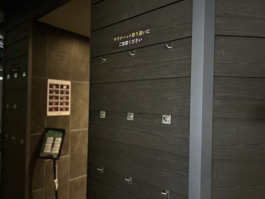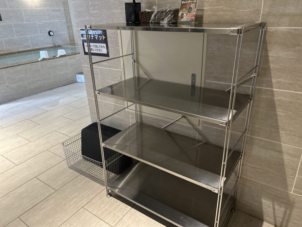 サウナ室前には荷物を置けるラックが用意されているので、ペットボトルなどを持ち込むときも便利。