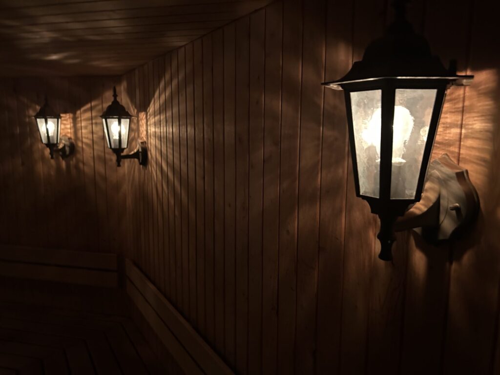周囲のランプ風照明が木の壁に柔らかな影をつくり、重厚感と温かみのある雰囲気を演出しています。熱さだけでなく“空間そのものに包まれる感覚”が魅力です。