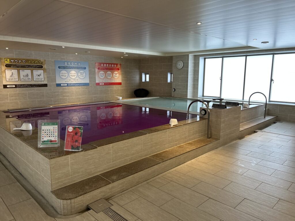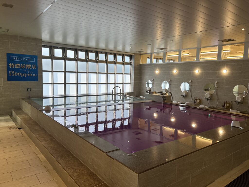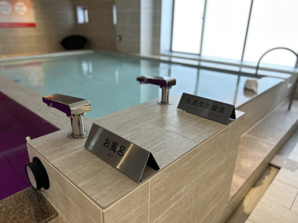 男性浴室には通常の浴槽に加え、特濃1500ppmの炭酸泉を完備。炭酸の細やかな泡が血行を促進し、サウナ後のクールダウンやリカバリーに最適。