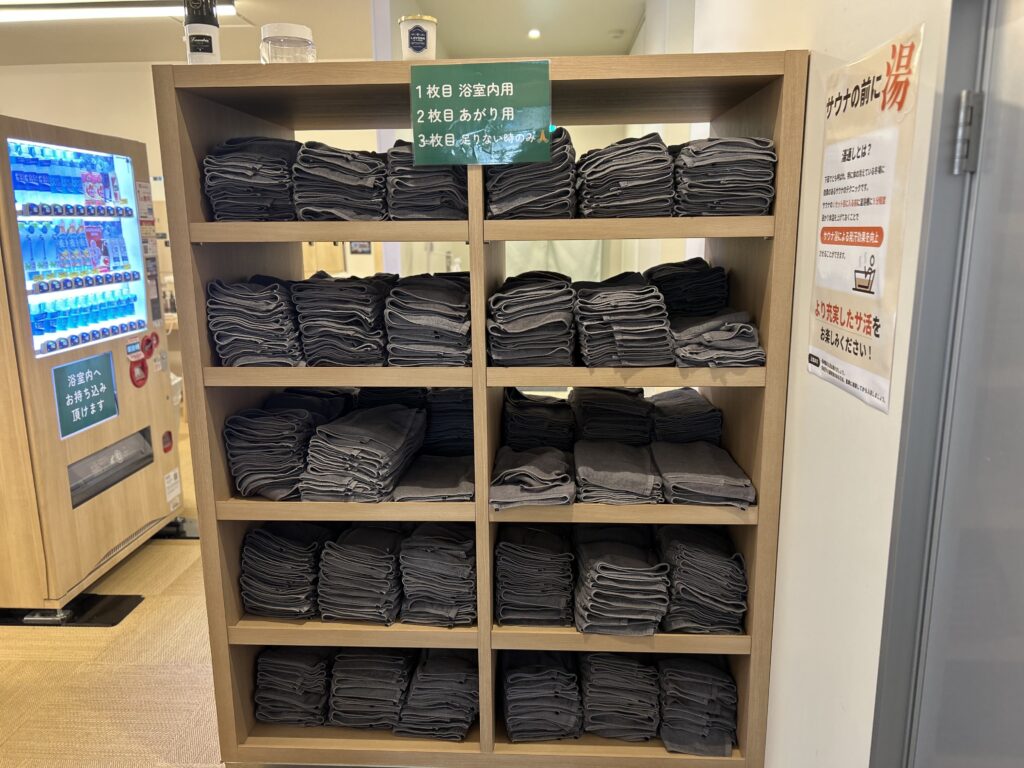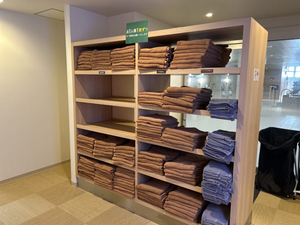 浴室手前には用途ごとに用意されたタオルがずらり。必要なものをすぐに手に取れる導線でストレスフリー。初めての方でも迷わず快適に利用できます。