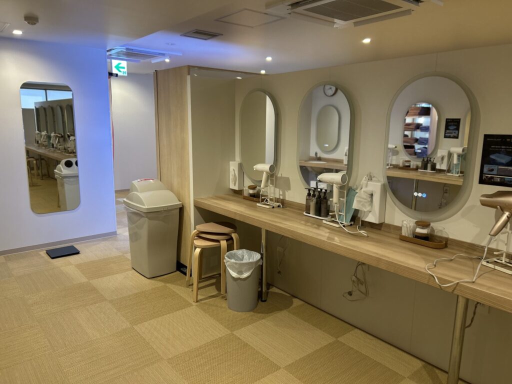 パウダースペースには人気のSALONIAのドライヤーやヘアアイロンを完備。髪のスタイリングまでできるのが嬉しいポイントです。綿棒やコットンなどのアメニティも揃い、サウナ後の身支度も安心。