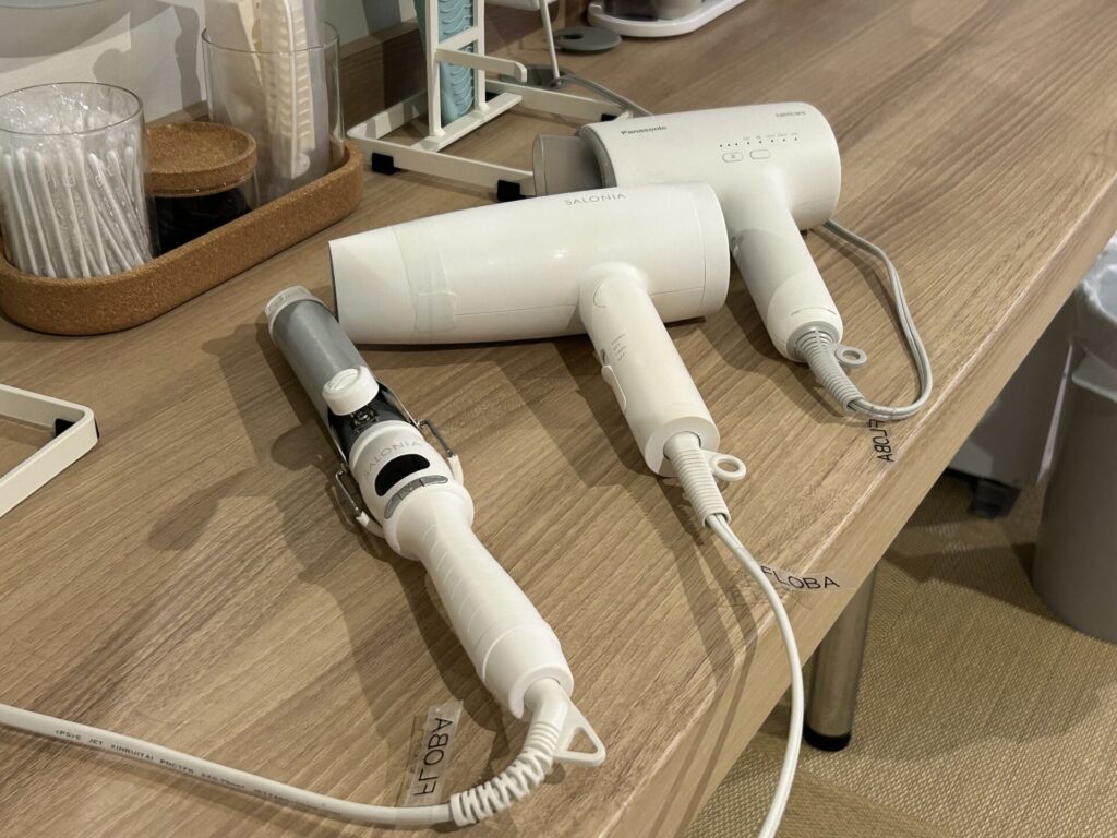 シャンプー・トリートメント・ボディソープをはじめ、人気ブランドのドライヤーやスキンケア用品を完備。女性側はヘアアイロンもあり、予定前の利用でも安心です。