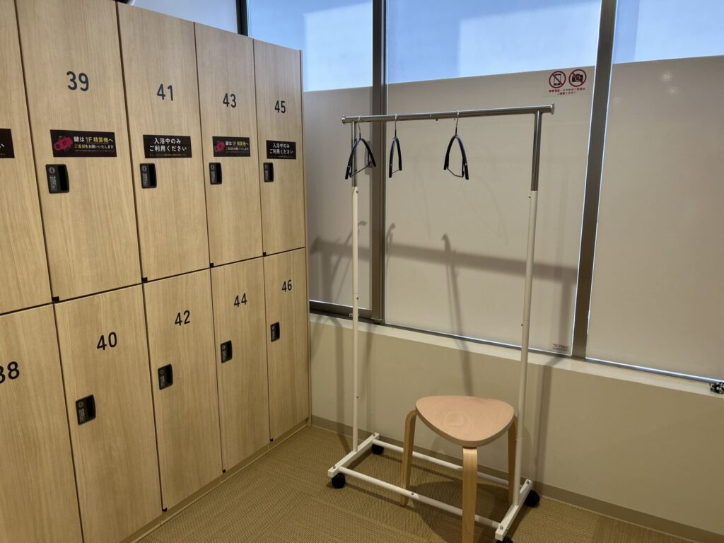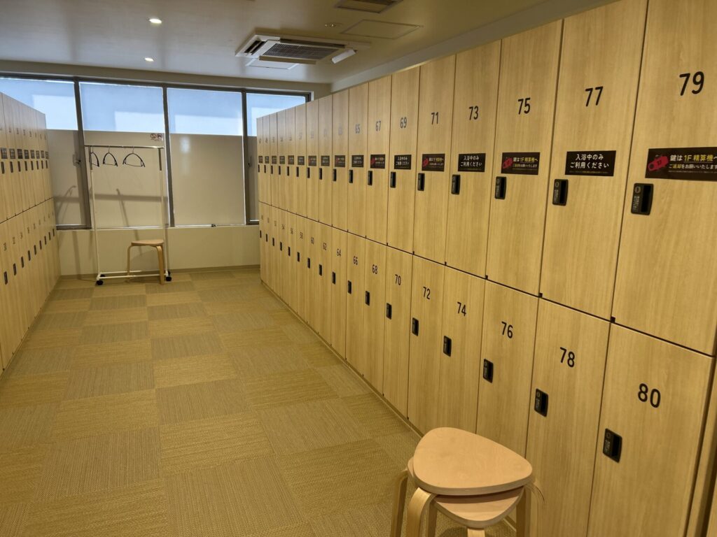 男性側の脱衣所です。ロッカー数が多く、荷物が多めでも安心。清潔感のある脱衣所にはドライヤーや鏡も完備されており、サウナ前後の身支度も快適に行えます。