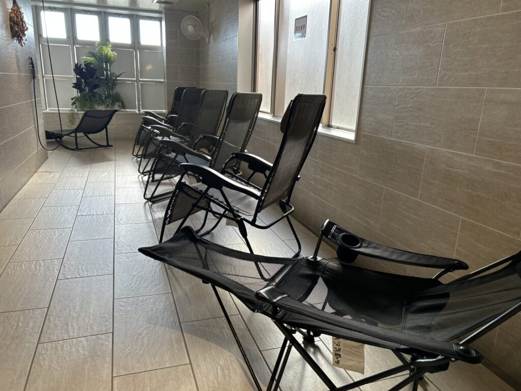 女性専用エリアの内気浴スペースには、10脚ものインフィニティチェアが用意されています。窓際に並んだ椅子は自然光に照らされ、清潔感あふれる空間。サウナ後にしっかりととのうには十分な数で、混雑時でも安心です。