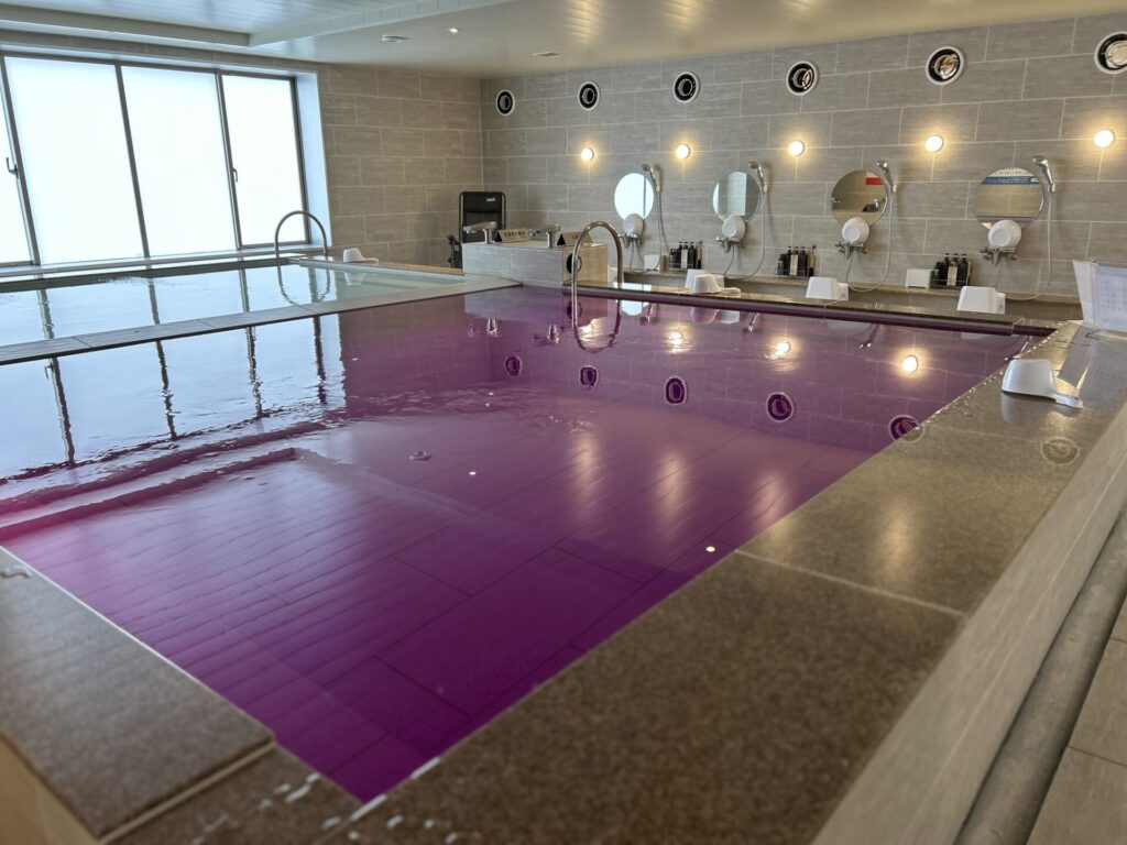 男性用フロアの上の階(4階)です。正面には水風呂、左奥にはサウナ室、そしてその周りを囲むようにインフィニティチェアが並ぶ内気浴スペース。