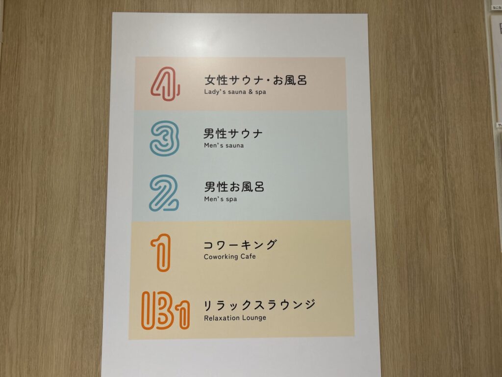 上から女性用サウナ&お風呂、男性用サウナ、男性用お風呂、コワーキング、リラックスラウンジとシンプルな縦導線。