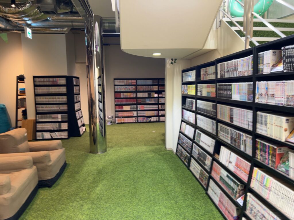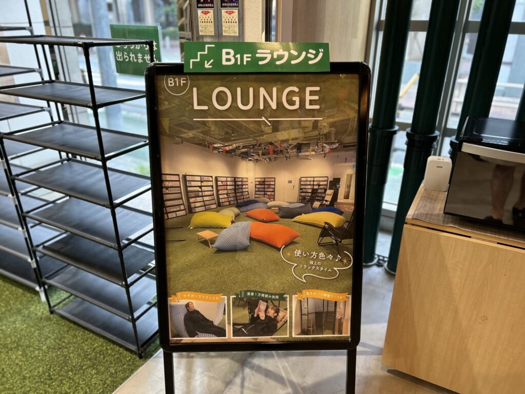 1階にはカフェ&ダイニングがあり、オロポやスムージー、カレーなどの食事が楽しめます。地下1階はラウンジフロアで、1万冊以上の漫画やリクライニングシート、ビーズクッションなどが揃い、作業や休憩に最適。
