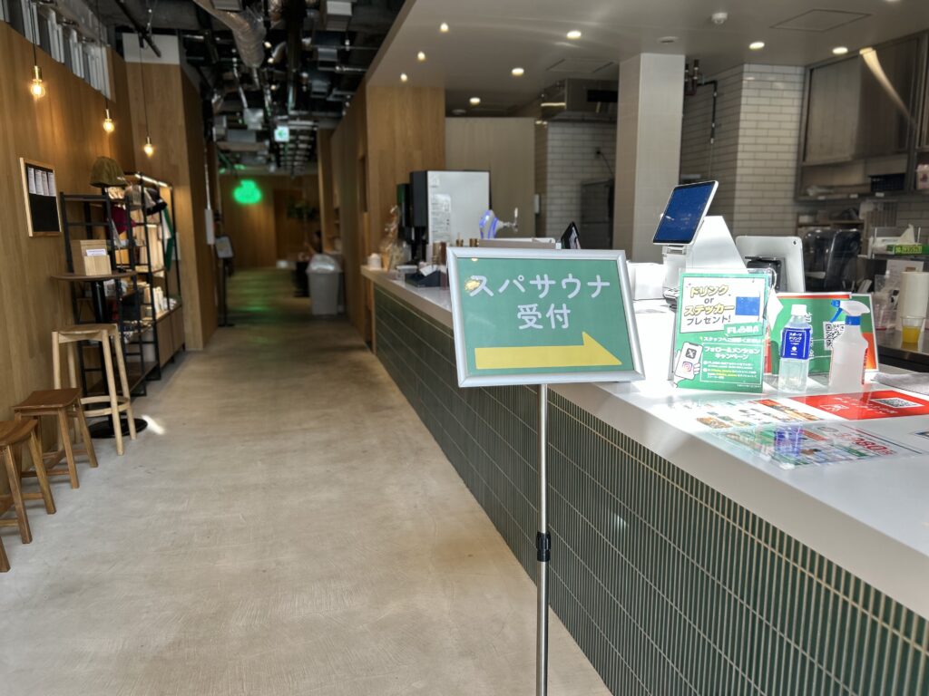 入口を入ると、清潔な雰囲気のエントランスが広がります。カウンターではサウナ利用の受付が行われ、初めて訪れる方でも安心。奥へ進むと館内各フロアへ繋がる導線が続き、シンプルながら洗練された空間デザイン。