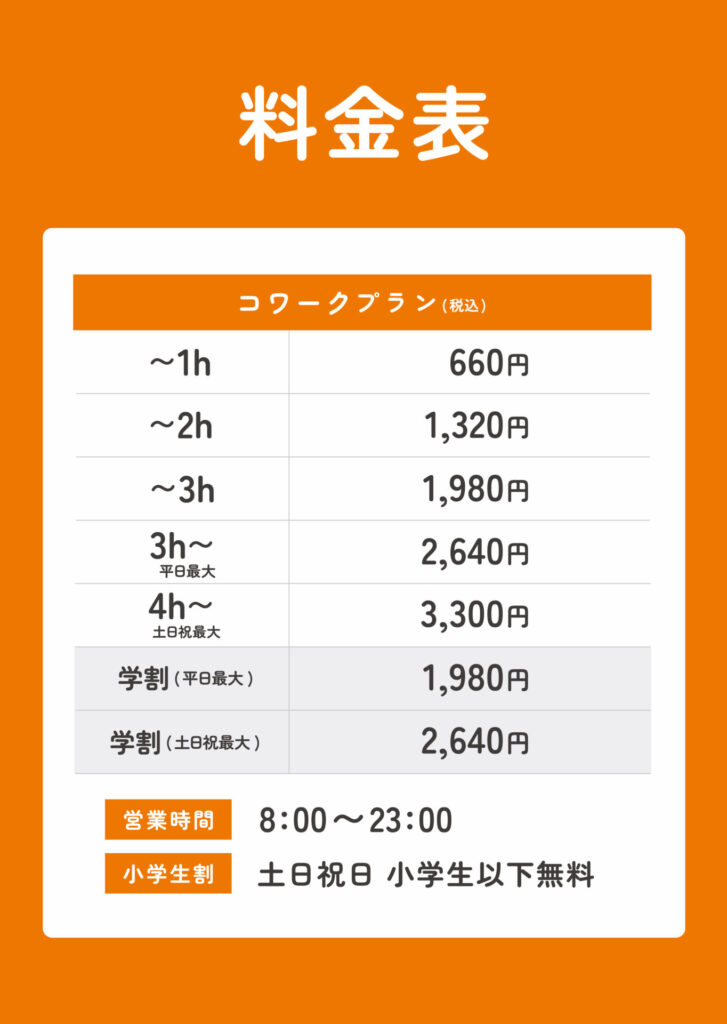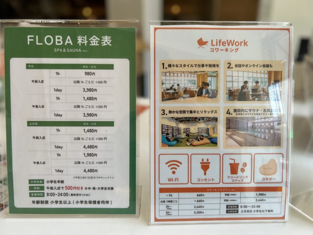 平日と土日祝で料金が異なる料金設定。隣には新しくできたLifeWorkコワーキングの案内。Wi-Fi・電源・フリードリンクを備えた快適な作業環境を提供しています。