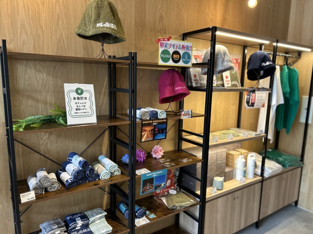 入り口にはサウナハットやMOKUタオル、アパレルなど様々なオリジナルグッズがありました。