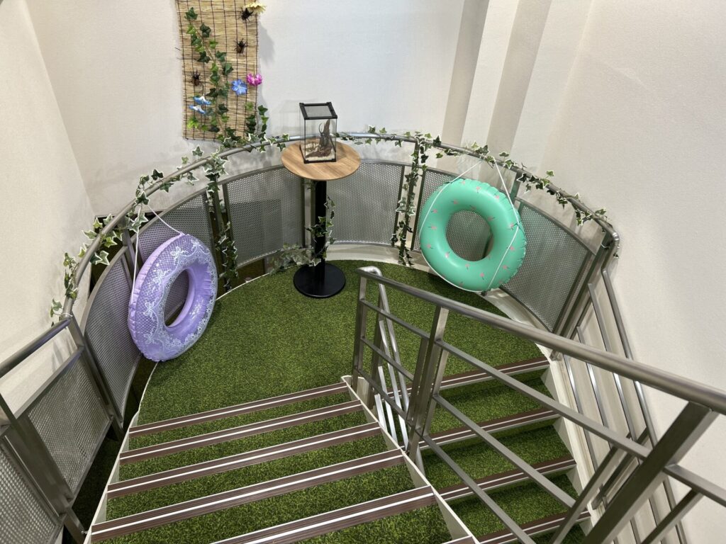 階段を上がるとすぐに目に入るのが、ずらりと並んだインフィニティチェア。シンプルな空間に観葉植物が配置されていて、光が差し込む雰囲気はちょっとした都会の隠れ家のよう。