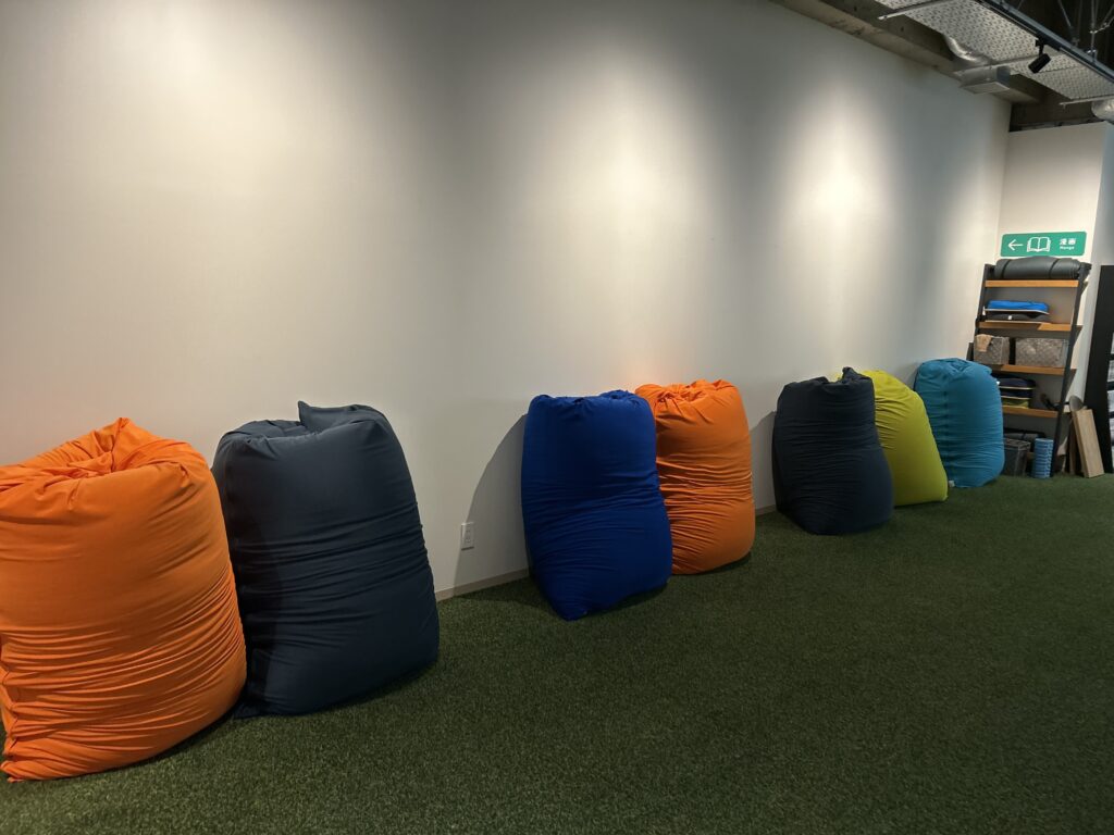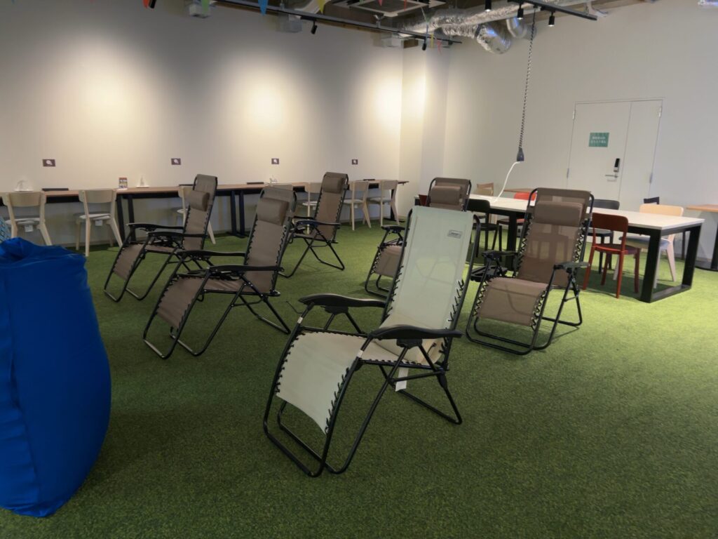 色とりどりのクッションやリクライニングチェアが配置され、ゴロゴロくつろげるのも魅力。人工芝が敷かれたフロアは明るくカジュアルで、友達同士でも一人でもリラックスできる雰囲気です。